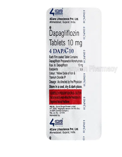 4 DAPA 10mg Tablets is a SGLT-2 inhibitor. It works by blocking the action of a protein called SGLT-2 in the kidneys. This action prevents the reabsorption of glucose and sodium ions in the kidneys. As a result, it excretes excess glucose from the body in the form urine leading to decrease in blood sugar levels. It also protects kidney function and prevents it from further damage. Additionally, it reduces the strain on the heart and helps it to pump blood more efficiently with less pressure.