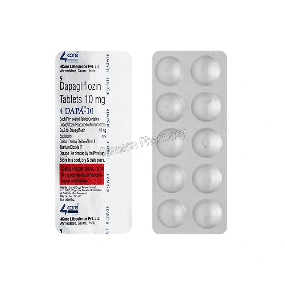 It is caused due to inadequate production of a hormone called insulin (produced by pancreas to metabolize glucose) in the body or due to inadequate sensitivity of body cells to the actions of insulin. During therapy with 4 DAPA 10mg Tablets, your doctor might regularly monitor your blood sugar levels and kidney functions to avoid the risk of unwanted side effects.