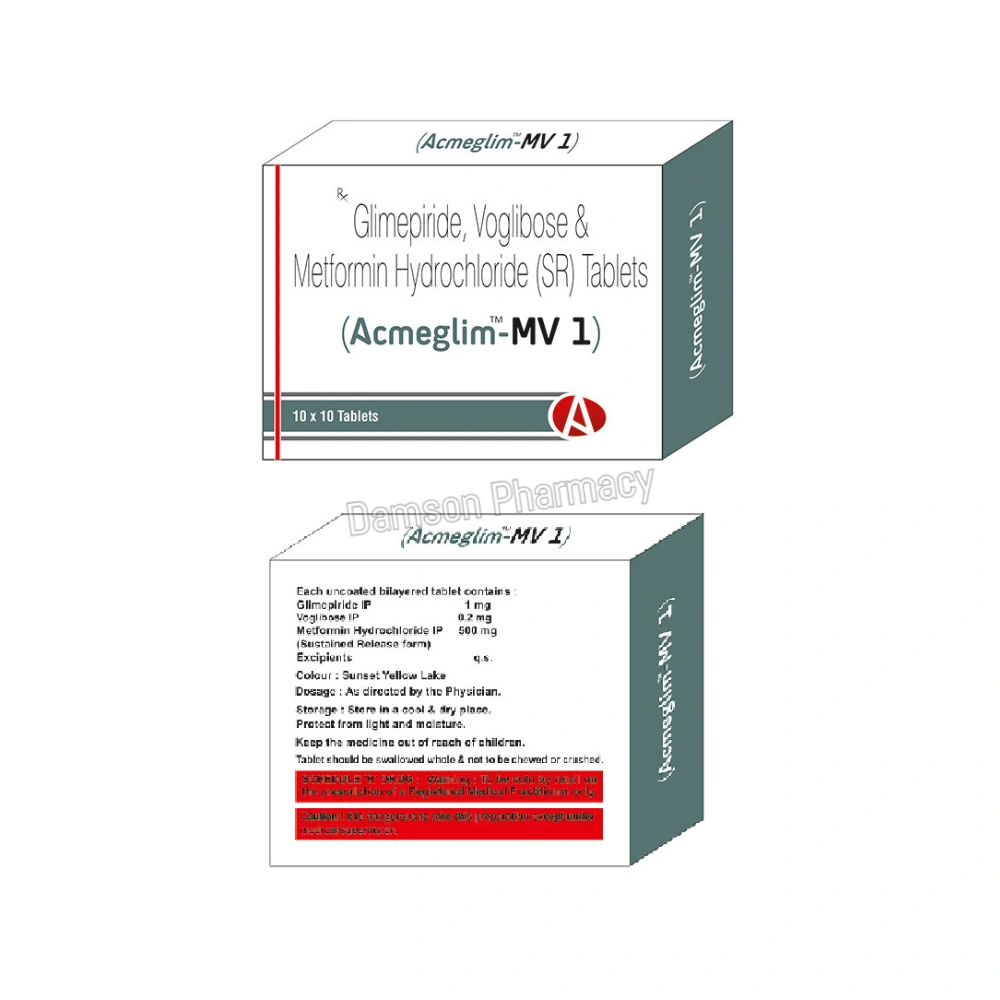 Voglibose, an alpha-glucosidase inhibitor, slows down the absorption of carbohydrates from the intestine, which helps prevent sharp spikes in blood sugar after meals. Taken usually with meals, Acmeglim MV 1 provides comprehensive blood sugar control by combining the strengths of these three medicines.