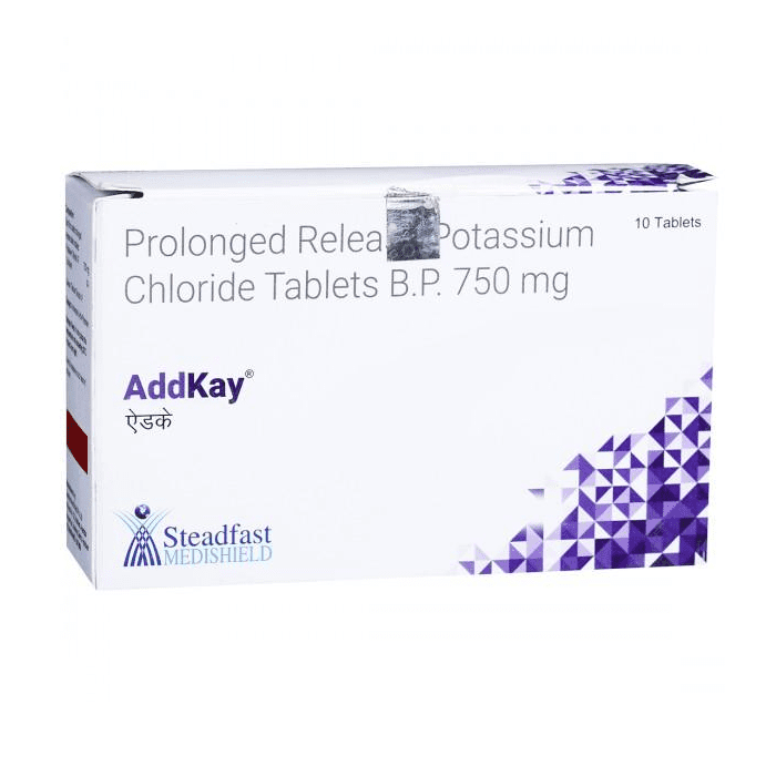 Addkay 750mg contains potassium chloride, a mineral supplement that helps restore and maintain the normal level of potassium in the blood. It replenishes potassium lost due to conditions like vomiting, diarrhea, or the use of certain medications such as diuretics or corticosteroids.