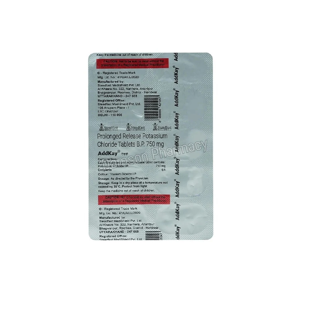 Addkay 750mg Tablets are commonly used to treat or manage low potassium levels in the body, a condition known as hypokalemia. Maintaining proper potassium levels is vital for the normal functioning of cells, muscles, and nerves, especially the heart and skeletal muscles. Manufacturers of Addkay 750mg is Steadfast Medishield Pvt Ltd.