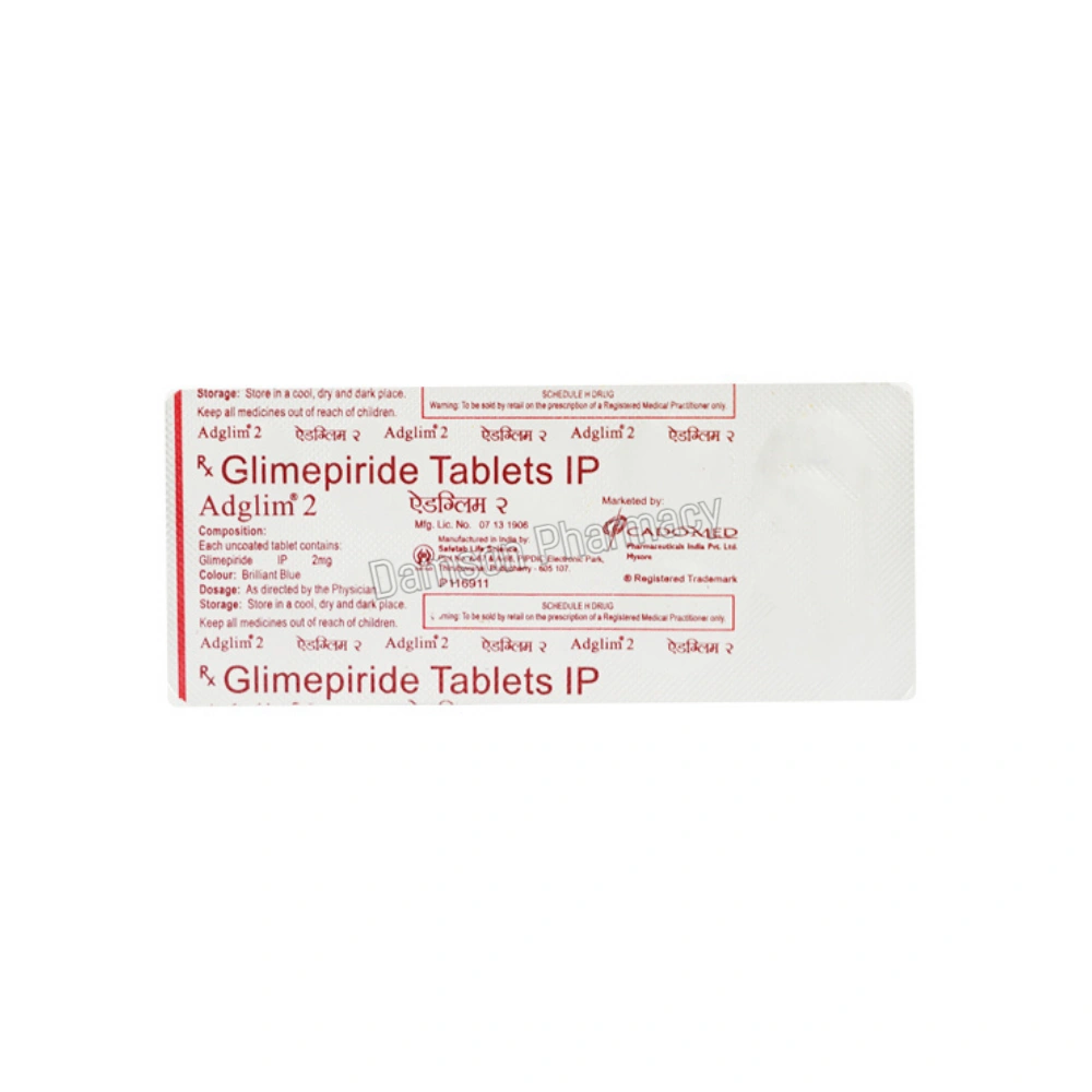 Adglim 2mg Tablet is an antidiabetic medicine. It stimulates the pancreas to secrete more insulin (a hormone involved in glucose metabolism). It also makes our body more sensitive to insulin which helps in digesting the circulating sugars (glucose) in the blood, thereby reducing blood sugar levels.