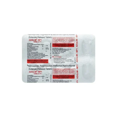 Adglim MP1 Tablet is a combination of Glimepiride, Metformin and Pioglitazone which belongs to the group of medicines called Antidiabetic agents. It is used in adults to treat type II diabetes mellitus when diet, exercise and treatment with single agents does not result in adequate sugar control.