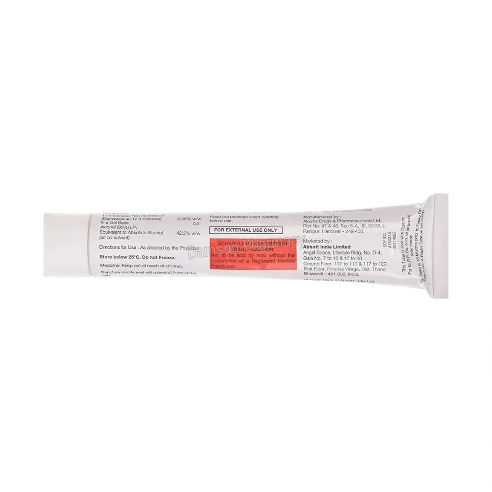 Akums Drugs and Pharmaceuticals Ltd. is the manufacturer of Estrabet Estradiol 0.06% Gel, a hormone replacement therapy product. Akums is a major Indian pharmaceutical company specializing in contract development and manufacturing (CDMO), producing high‑quality medicines, active pharmaceutical ingredients (APIs), topical gels, and other formulations for both domestic and global markets. The company combines rigorous research, advanced technology, and stringent quality standards in its drug production process.