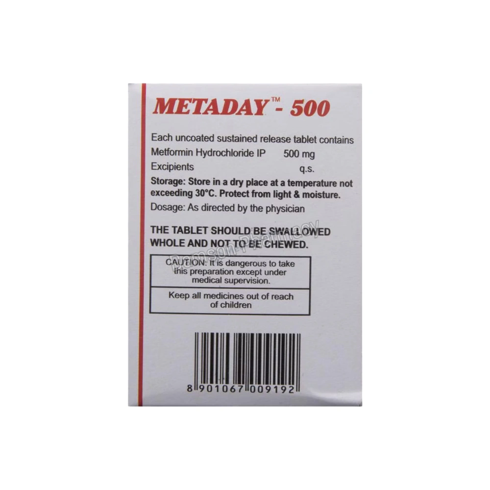 Metaday 500mg Tablets is an antidiabetic medicine. It makes the body more sensitive to insulin (a hormone involved in glucose metabolism). This helps our body cells to utilize more amount of the circulating blood glucose, thereby reducing blood sugar levels. Additionally, it also prevents glucose production by the liver and reduces its absorption in the body.