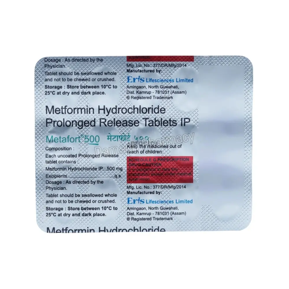 Metafort 500mg Tablets is an antidiabetic medicine. It makes the body more sensitive to insulin (a hormone involved in glucose metabolism). This helps our body cells to utilize more amount of the circulating blood glucose, thereby reducing blood sugar levels. Additionally, it also prevents glucose production by the liver and reduces its absorption in the body.