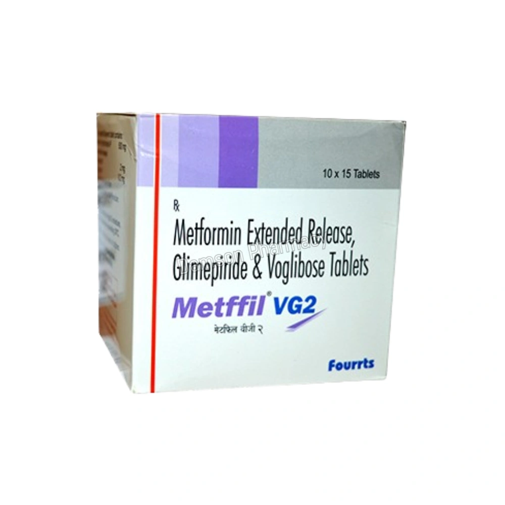 Metffil VG2 Tablet is a combination of Glimepiride, Metformin and Voglibose which belongs to the group of medicines called Antidiabetic Agents. Metffil VG2 Tablet is used in adults to treat type 2 Diabetes mellitus when diet, exercise and single agents/ second line therapy with two drugs are insufficient to adequately control blood sugar level.