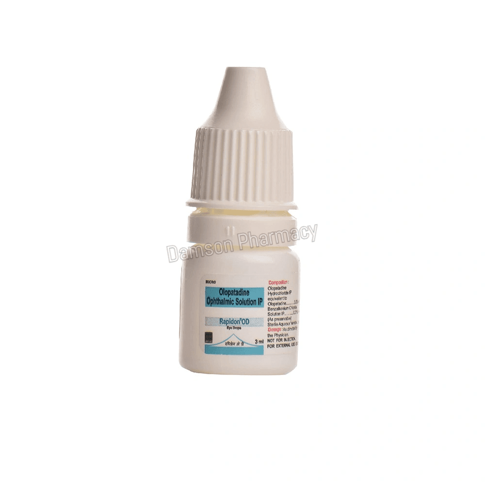 Rapidon OD Eye Drops 3ml belongs to a group of medicines called antihistamines. It is used to treat seasonal allergic conjunctivitis (infection, itching, redness, and swelling of the eye) caused due to pollens, dust, animal fur, and other allergens.