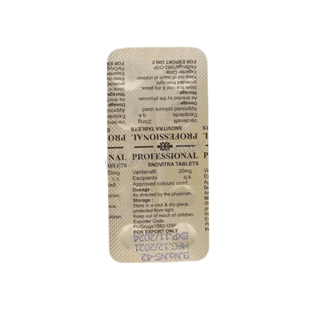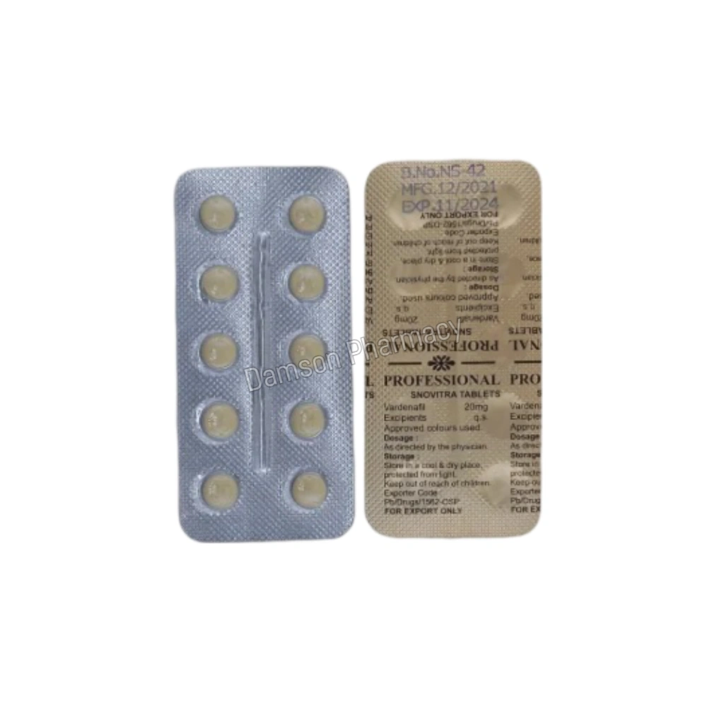 Snovitra Professional 20 mg is an advanced formulation of Vardenafil, a phosphodiesterase type 5 (PDE5) inhibitor, designed to treat erectile dysfunction (ED) in men. Unlike standard Vardenafil tablets, Snovitra Professional offers enhanced efficacy and a longer duration of action, making it a preferred choice for those seeking improved sexual performance.