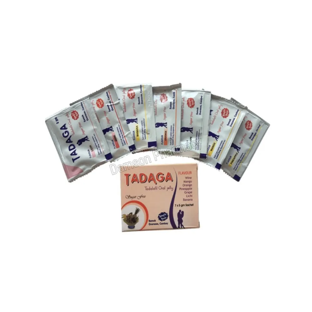 Tadaga 5gm Oral Jelly contains tadalafil, a phosphodiesterase type 5 (PDE5) inhibitor. This compound is responsible for relaxing blood vessels and improving blood flow to certain parts of the body, particularly the penis.